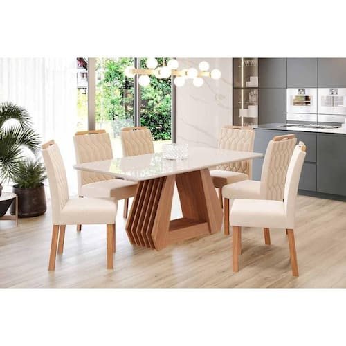 Conjunto: Mesa de Cozinha Ágata Tampo Madeirado c/ Vidro 180x90cm e 6 Cadeiras Paola Cinamomo/Off White - Carvalho/Suede Nude Bege - Cimol - Conjunto de Mesa de Cozinha com 6 Cadeiras