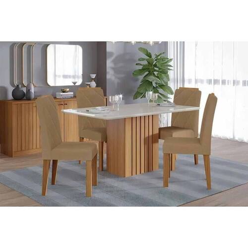 Conjunto: Mesa de Cozinha Ana Tampo Madeirado c/ Vidro 130x80cm e 4 Cadeiras Fernanda Nature/Off White - Carvalho/Suede Joli Capuccino - Cimol - Conjunto de Mesa de Cozinha com 4 Cadeiras