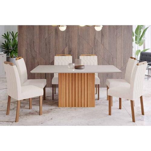 Conjunto: Mesa de Cozinha Ana Tampo Madeirado c/ Vidro 180x90cm e 6 Cadeiras Paola Cinamomo/Off White - Carvalho/Suede Nude Bege - Cimol - Conjunto de Mesa de Cozinha com 6 Cadeiras