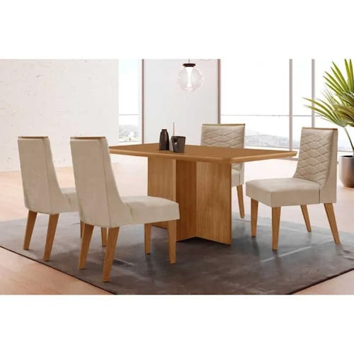 Sala de Jantar Completa Berlim c/ Tampo Madeirado Canto Curvo 120x80cm e 4 Cadeiras Maldivas Naturale - Suede Creme - Rufato