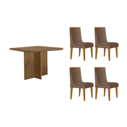 Conjunto: Mesa de Cozinha Berlim c/ Tampo Madeirado Canto Curvo 90x90cm e 4 Cadeiras Dakota Naturale - Corano Capuccino - Rufato - Conjunto de mesa de cozinha com 4 cadeiras