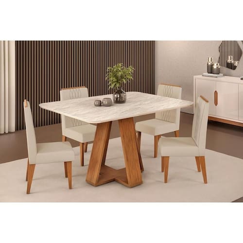 Sala de Jantar Completa Celeste c/ Tampo Madeirado Curvo 120x90cm e 4 Cadeiras Lia Freijo/Quartzo - Linho Neve - DJ Móveis