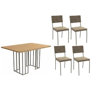 Sala de Jantar Completa Duina c/ Tampo de Madeira 136cm e 4 Cadeiras Zaria Niquel/Freijo - Suede Bege - Kappesberg