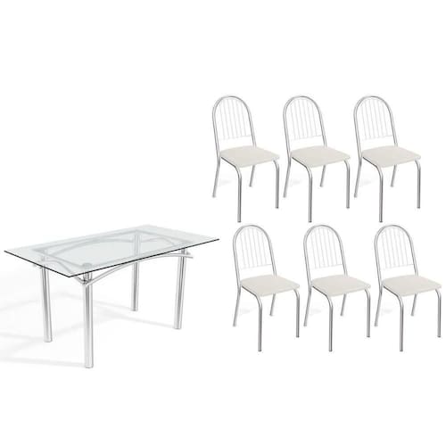 Conjunto: Mesa De Cozinha Elba C/ Tampo De Vidro 150cm E 6 Cadeiras Noruega Cromada - Courano Branco - Kappesberg