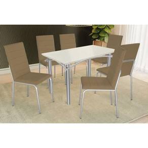 Sala de Jantar Completa Elba Tampo Madeirado c/ Vidro 120cm e 6 Cadeiras Amsterdã Cromada/Off White - Courano Capuccino - Kappesberg
