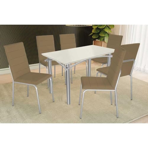 Abaixo segue os produtos do KIT: Sala de Jantar Completa Elba Tampo Madeirado c/ Vidro 120cm e 6 Cadeiras Amsterdã Cromada/Off White - Courano Capuccino - Kappesberg