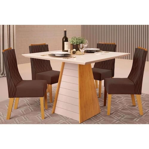 Sala de Jantar Completa Fler Tampo Madeirado c/ Vidro 90x90cm e 4 Cadeiras Jade Cedro/Off White - Suede Moca - DJ Móveis Abaixo segue os produtos do KIT: Sala de Jantar Completa Fler Tampo Madeirado c/ Vidro 90x90cm e 4 Cadeiras Jade Cedro/Off White - Suede Moca - DJ Móveis