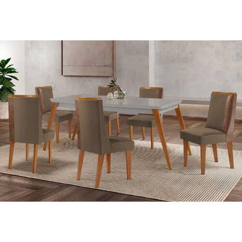 Sala de Jantar Completa Havana c/ Tampo Madeirado c/ Vidro Canto Curvo 180x90cm e 6 Cadeiras Tilia Naturale/Off White - Suede Capuccino - Rufato Abaixo segue os produtos do KIT: Sala de Jantar Completa Havana c/ Tampo Madeirado c/ Vidro Canto Curvo 180x90cm e 6 Cadeiras Tilia Naturale/Off White - Suede Capuccino - Rufato