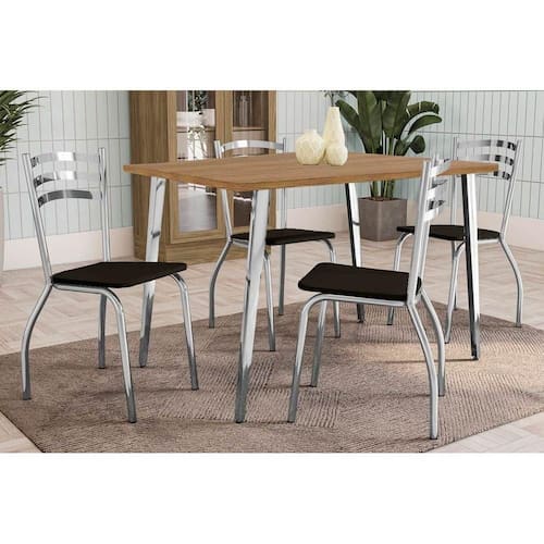 Sala de Jantar Completa Iguaçu c/ Tampo de Madeira 136cm e 4 Cadeiras Portugal Cromada/Nogueira - Courano Preto - Kappesberg Abaixo segue os produtos do KIT: Sala de Jantar Completa Iguaçu c/ Tampo de Madeira 136cm e 4 Cadeiras Portugal Cromada/Nogueira - Courano Preto - Kappesberg