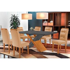 Conjunto: Mesa de Cozinha Imperatriz Tampo Madeirado c/ Vidro Curvo 180x90 e 6 Cadeiras Imperatriz Imbuia/Suede Capuccino - Rufato - Blush