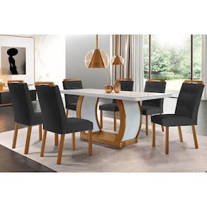 Abaixo segue os produtos do KIT: Sala de Jantar Completa Jade Tampo Madeirado c/ Vidro Canto Curvo 180x90 e 6 Cadeiras Imperatriz Imbuia/Off White - Suede Grafite - Rufato