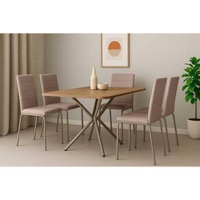 Conjunto: Mesa de Cozinha Loire c/ Tampo de Madeira 1.60cm + 6 Cadeiras Amsterdã Niquel/Corano Bege - Kappesberg - Blush