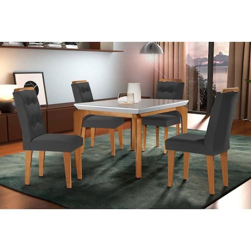Abaixo segue os produtos do KIT: Sala de Jantar Completa Londrina c/ Tampo Madeirado c/ Vidro Canto Curvo 120x80cm e 4 cadeiras Imperatriz Imbuia/Off White - Suede Grafite - Rufato