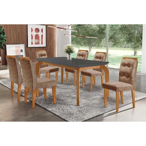 Conjunto: Mesa de Cozinha Londrina c/ Tampo Madeirado c/ Vidro Canto Curvo 180x90cm e 6 cadeiras Imperatriz Imbuia/Grafite - Suede Capuccino - Rufato - Blush