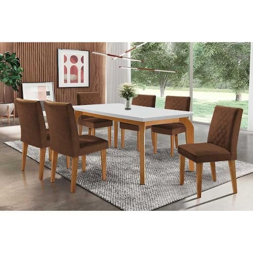 Conjunto: Mesa de Cozinha Londrina c/ Tampo Madeirado Canto Reto 180x90cm e 6 cadeiras Jade Imbuia-Capuccino/Suede Marrom - Rufato - Blush