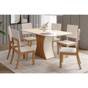 Conjunto: Mesa De Cozinha Luiza C/ Tampo Curvo Madeirado C/ Vidro 160x80cm E 6 Cadeiras Milla Nature/linho - Henn