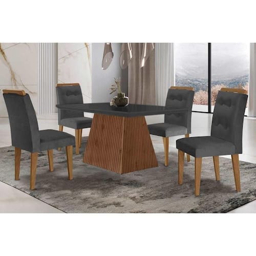 Sala de Jantar Completa Luna c/ Tampo Madeirado c/ Vidro Canto Curvo 120x80cm e 4 cadeiras Imperatriz Imbuia/Grafite - Suede Grafite - Rufato