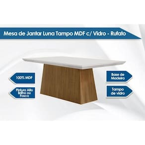Mesa de Sala Jantar Luna c/ Tampo 180x90cm Madeirado Vidro Canto Curvo - Imbuia/Ripado 3D/Off White - Rufato