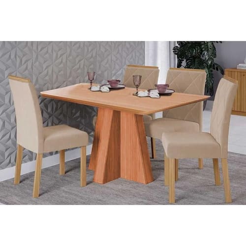 Sala de Jantar Completa Maitê Tampo Madeirado 130x80cm e 4 Cadeiras Fernanda Cinamomo - Carvalho/Suede Nude Bege - Cimol