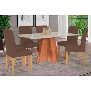 Conjunto: Mesa de Cozinha Maitê Tampo Madeirado c/ Vidro 160x80cm e 6 Cadeiras Maia Cinamomo/Off White - Nature/Suede Mascavo Chocolate - Cimol - Conjunto de Mesa de Cozinha com 6 Cadeiras
