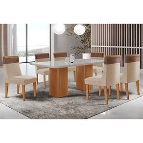 Conjunto: Mesa de Cozinha Maldivas c/ Tampo Madeirado c/ Vidro Canto Curvo 180x90cm e 6 Cadeiras Jaspe Naturale/Off White - Suede Creme - Rufato - Conjunto de mesa de cozinha com 6 cadeiras