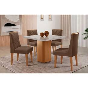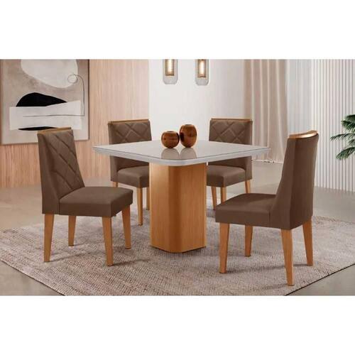 Conjunto: Mesa de Cozinha Maldivas c/ Tampo Madeirado c/ Vidro Canto Curvo 90x90cm e 4 Cadeiras Pietá Naturale/Off White - Suede Marrom - Rufato - Conjunto de mesa de cozinha com 4 cadeiras