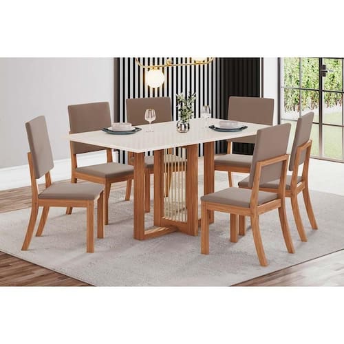 Sala de Jantar Completa Natalí c/ Tampo Madeirado Reto s/ Vidro 160x90cm e 6 Cadeiras Milla Nature/Suede Light Marrom Amêndoa - Henn Abaixo segue os produtos do KIT: Sala de Jantar Completa Natalí c/ Tampo Madeirado Reto s/ Vidro 160x90cm e 6 Cadeiras Milla Nature/Suede Light Marrom Amêndoa - Henn