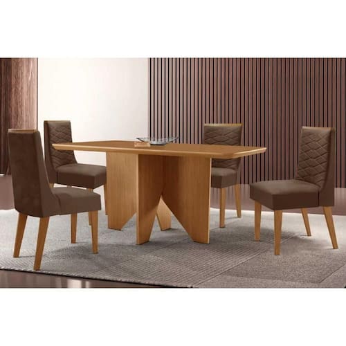 Conjunto: Mesa de Cozinha Nevada c/ Tampo Madeirado Canto Curvo 120x80cm e 4 Cadeiras Maldivas Naturale - Suede Marrom - Rufato - Conjunto de Mesa de Cozinha com 4 Cadeiras