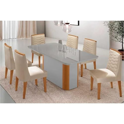 Sala de Jantar Completa Pietá c/ Tampo Madeirado c/ Vidro Canto Curvo 180x90cm e 6 Cadeiras Maldivas Naturale/Off White - Suede Creme - Rufato Abaixo segue os produtos do KIT: Sala de Jantar Completa Pietá c/ Tampo Madeirado c/ Vidro Canto Curvo 180x90cm e 6 Cadeiras Maldivas Naturale/Off White - Suede Creme - Rufato