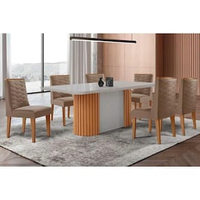 Sala de Jantar Completa Pilar c/ Tampo Madeirado c/ Vidro Canto Curvo 180x90cm e 6 Cadeiras Dafne Naturale/Off White - Suede Capuccino - Rufato Abaixo segue os produtos do KIT: Sala de Jantar Completa Pilar c/ Tampo Madeirado c/ Vidro Canto Curvo 180x90cm e 6 Cadeiras Dafne Naturale/Off White - Suede Capuccino - Rufato