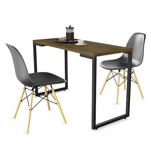 Antes de comprar algum móvel para casa, planeje-se! Hoje em dia com ambientes cada vez mais compactos é importante otimizar os espaços, seja na Cozinha, Sala de Jantar ou qualquer outro cômodo da Casa ou Apartamento. Pensando nisso apresentamos o Conjunto Mesa de Cozinha Prattica Industrial 120cm e 2 Cadeiras Eames F02 Castanho/Preto - Mpozenato , nosso mais novo lançamento, uma ótima solução para momentos como esse.O Conjunto Mesa de Cozinha Prattica é bonito, charmoso e conta com um Design Estilo Industrial único, e você vai ser surpreender! Além disso é um Móvel Multiuso, uma verdadeira “mão na roda” para quem convive com a correria do dia-a-dia, podendo ser utilizada para refeições, lanches rápidos, ou até mesmo como Mesa de Trabalho no seu Home Office para acomodar Notebook ou Desktop.Este móvel é produzido com pés metálicos e tampo em MDP com acabamento BP, o que torna o produto mais durável e resistente a umidade. Não é demais?! Compre já!Dimensões do Produto (Largura x Altura x Profundidade):Mesa 120 x 75 x 50 cm.Peso: 16 Kg.Cadeiras 46 x 82 x 51 cm.Peso: 8 Kg Cada.Características do ProdutoMaterial da Estrutura: MDP 25mm / Metálica.Peso Suportado: Mesa: 15 Kg / Cadeiras: 120 Kg cada.Acabamento: Pintura BP.Mesa com Regulagem de Altura: Sim.Cadeiras com Regulagem de Altura: Não.Material do Assento: Polipropileno.Escala de Brilho: Fosco.Quantidade de Lugares: 2 Lugares.Possui Pés: Sim.Tipo de Pés: Pés Metálicos.Diferenciais:- Design moderno.- Fácil montagem.- Design Industrial.Sistema de Montagem: Miniflix / Cavilhas / Parafusos.Manual de Montagem: Sim.Complexidade da Montagem: Média.Volumes: 4 Volumes.Conteúdo da Embalagem: 1 Mesa, 2 Cadeiras.Montagem: Recomendamos que seja feita por um profissional.Recomendação de Limpeza: Utilize pano levemente úmido.Observações importantes:- Produto para uso residencial em ambiente interno, não devendo ficar exposto diretamente ao sol, calor e umidades excessivas.- Pode haver alguma diferença de tonalidade entre a imagem e o produto real, por conta do tratamento de imagens e a calibração de cores do seu monitor.- As imagens são meramente ilustrativas, não acompanham objetos de decoração e eletrônicos.- Confira o estado da embalagem, não devendo assinar o comprovante em caso de danos.- Não asseguramos, no ato da entrega, por subir escadas/elevadores, pelo transporte por guincho em apartamentos ou montagem, desmontagem e instalações. Eventuais despesas são por conta do comprador.- Confira as dimensões do produto e certifique-se de que passará normalmente por supostos elevadores, portas, escadas e/ou corredores de sua residência.