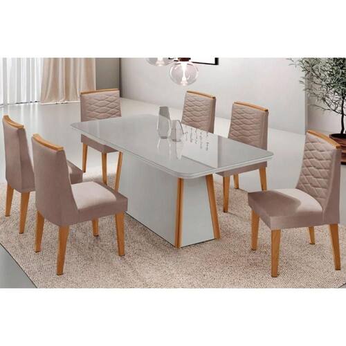 Sala de Jantar Completa Tilia c/ Tampo Madeirado c/ Vidro Canto Curvo 180x90cm e 6 Cadeiras Maldivas Naturale/Off White - Linho Capuccino - Rufato Abaixo segue os produtos do KIT: Sala de Jantar Completa Tilia c/ Tampo Madeirado c/ Vidro Canto Curvo 180x90cm e 6 Cadeiras Maldivas Naturale/Off White - Linho Capuccino - Rufato