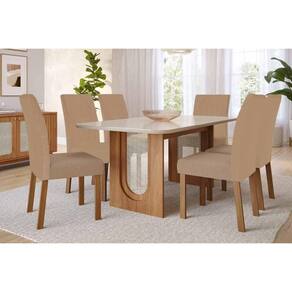 Conjunto: Mesa de Cozinha Valentina Tampo Madeirado c/ Vidro 180x90cm e 6 Cadeiras Maia Cinamomo/Off White - Nature/Suede Gengibre Bege - Cimol - Conjunto de Mesa de Cozinha com 6 Cadeiras