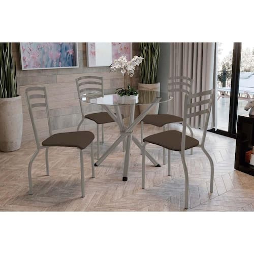 Sala de Jantar Completa Volga c/ Tampo de Vidro 95cm e 4 Cadeiras Portugal Niquel - Courano Marrom - Kappesberg Abaixo segue os produtos do KIT: Sala de Jantar Completa Volga c/ Tampo de Vidro 95cm e 4 Cadeiras Portugal Niquel - Courano Marrom - Kappesberg