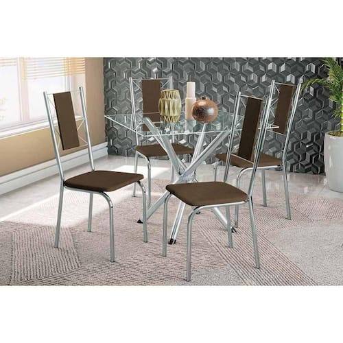 Conjunto: Mesa De Cozinha Volga C/ Tampo De Vidro 90cm E 4 Cadeiras Lisboa Cromada - Courano Marrom - Kappesberg