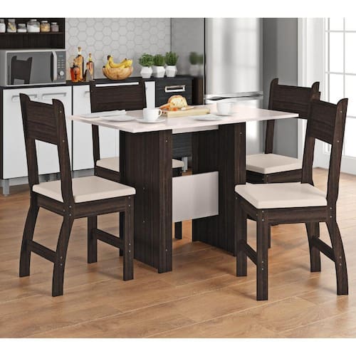 Características: Acabamento pintura UV, bordas em OS, resistente. Estrutura da mesa MDP 15mm Estrutura cadeira MDP 15mm e MDF 18mm Assento em material sintético 4 Cadeiras