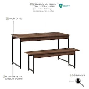 O conjunto de mesa com 01 banco da linha Active é perfeito para sua sala de jantar ou de lazer, levando o estilo de decoração industrial e contemporâneo a sua casa. Fabricado com estrutura em tubos de aço com pintura epóxi e MDP Perffect com Microban que inibe a proliferação de fungos e bactérias, além das fitas em PVC, conferindo muito mais qualidade ao seu móvel. Acabamento da Cadeira/Banco: Acetinado Acabamento da Mesa: Acetinado Almofada do assento: Altura do Conjunto: 74 Ambiente Principal: Sala de Jantar Apoio para Braços Estofado: Cadeira/Banco estofada: Não Cadeira/Banco suporta até: 200 Complexidade da Montagem: Baixa: pode ser montado por uma pessoa sozinha Cor: Nogal Cor do Produto: Nogal Enchimento do Assento: Enchimento do Encosto: Escala de Brilho: Fosco Espessura do Tampo: 15 Estrutura do Assento: MDP 15mm Estrutura do Encosto: Informações Complementares: Itens Inclusos: 1 Mesa, 1 Banco, Kit Ferragens e Manual de Montagem Linha ou Coleção: Active Manual de Especificação Técnica: Manual de Montagem e Instalação: https://cdn2.madeiramadeira.com.br/atributo/compace-dalex/956107-manual-yescasa-mesa-de-jantar-1-banco.pdf Material da Base da Mesa: Aço Material da Estrutura da Cadeira: Aço Medida da Base (A x L x P): Medida da Cadeira/Banco (A x L x P): 43 x 129 x 36cm Medida da Mesa (A x L x P): 74 x 135 x 70cm Medida do Canto Alemão (A x L x P): Medida do Suporte Giratório (L x C x E): Medida do Tampo (L x C x E): 70 x 135 x 1,5cm Mesa suporta até: 90 Necessita Montagem: Sim Origem do Produto: Nacional Peso da Cadeira/Banco: 6.92 Peso da Mesa: 14 Possui Apoio para Braços: Não Possui Apoio Para os Pés: Não Possui Suporte Giratório: Recomendações de Uso, Manutenção e Limpeza: Para a limpeza, utilize flanela seca ou pano macio levemente umedecido em água. Utilize um pano seco em seguida. Evite contato com produtos químicos (solventes, thinner, acetona, etc) e não utilize nenhum tipo de esponja de aço. Revestimento da Cadeira/Banco: Sistema de Montagem: Bucha, Parafuso, Pé Nivelador, Pé Tubular Tamanho: Tipo de Madeira Maciça da Base da Mesa: Tipo de Madeira Maciça do Tampo: Vidro Temperado: