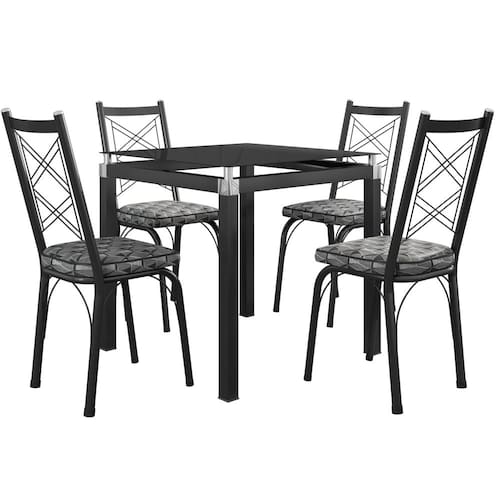 Conjunto Mesa de Jantar Tubular com 4 Cadeiras 143 Malva Tampo Vidro 75cm SF Preto Assento Mosaico Silver - Combo Stock