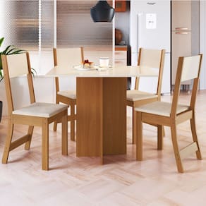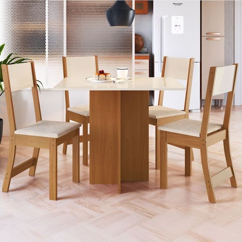 - Estrutura robusta em MDP e MDF, garantindo resistência e durabilidade por muito mais tempo. - Cadeiras com assentos acolchoados em espuma de poliuretano. - Revestimento dos assentos em tecido linho. - Design elegante e contemporâneo, com acabamento que valoriza qualquer espaço. - Ideal para cozinhas ou salas de jantar menores, aproveitando cada centímetro com charme e funcionalidade.