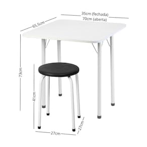 Dimensões do Produto Montado: Mesa: Altura: 73cm | Largura: 65,5cm | Profundidade: 35cm (fechada) - 70cm (aberta) Banqueta: Altura: 41cm | Largura: 27cm | Profundidade: 27cm *Você pode consultar as medidas detalhadas na imagem técnica do produto.