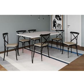 Conjunto Mesa De Jantar Elen Com 6 Cadeiras Katrina Base Preta E Tampo Branco 150cmA sua cozinha ou sala de jantar estará completa com esse maravilhoso conjunto para realizar as grandes as refeições e reuniões em família. E se você busca móveis com design contemporâneo, acompanhado de muita qualidade material e combinação de cores clássica, este modelo é para você!Tipo: Conjunto de Mesa e CadeirasModelo Mesa: ElenModelo Cadeira: KatrinaCor Mesa: Base Preto / Tampo Branco Cor Cadeira: Preto Medidas Mesa:Altura: 76cmLargura: 150cmComprimento: 90cmMedidas Cadeira:Altura: 90cmLargura: 48cmProfundidade: 46cmPeso: 5,1kgATENÇÃOIMAGENS MERAMENTE ILUSTRATIVAS REALIZADO EDIÇÃO, PODENDO HAVER UMA PEQUENA VARIAÇÃO DE COR DEPENDENDO DE CADA TELA OU MONITOR.Conjunto Mesa de Jantar Elen com 6 Cadeiras Katrina Base Preta e Tampo Branco 150cm