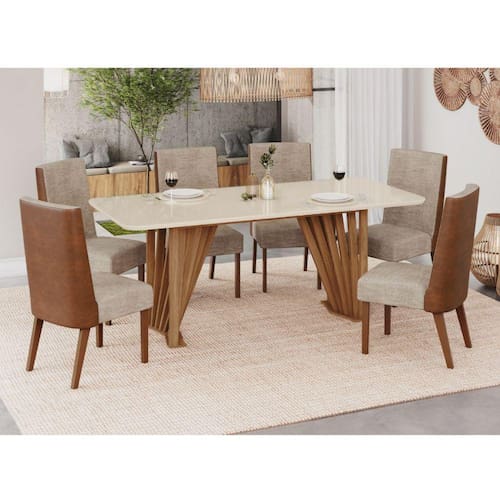 Caracteristicas Pés da Cadeira: Madeira Tecido da Cadeira: Linho e Corano Caixa: MDF 25MM Estrutura: MDP 25MM/15MM Madeira: 25MM Tampo: MDP 12MM/MDF 25MM Tampo: Vidro Canto Arrendondado