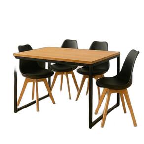 Conjunto Mesa de Jantar Industrial 120cm Tampo Amadeirado com 4 Cadeiras Pretas Pés de Madeira Design Moderno e Sofisticado
