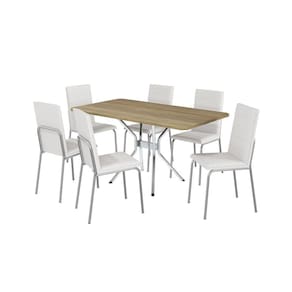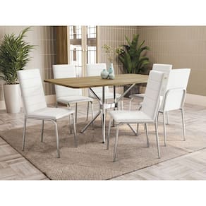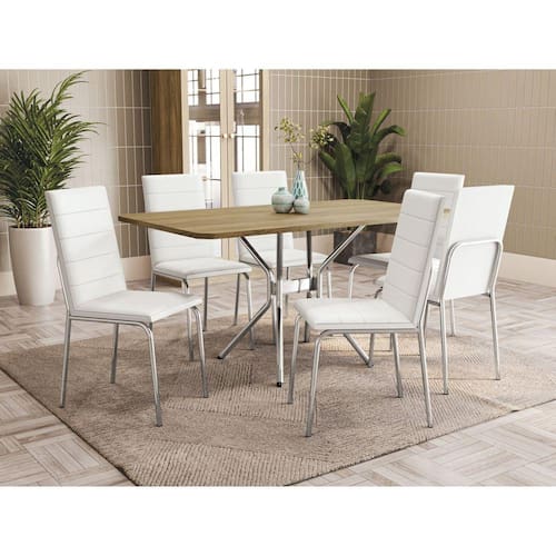 Receba sua família e amigos com toda a qualidade e beleza dos conjuntos da linha Crome da Kappesberg. Discreta e moderna, o conjunto da mesa Loire e cadeira Dalian da Kappesberg é perfeito para ser utilizado na sua cozinha, sala de jantar ou área de lazer. Produzido com estrutura metálica cromada, a mesa é moderna, garantindo estabilidade e segurança, e quando combinada ao tampo retangular em MDP e pintura touch na cor nogueira, com a textura dos veios da madeira, o conjunto se torna ainda mais prático e moderno, acomoda até seis pessoas, e suportando até 90kg.A cadeira Amsterdã possui um visual mais moderno, suportam até 130kg. Com encosto e assento revestidos em sintético branco, esbanja leveza e conforto ao sentar-se. Pés com acabamento em metal cromado, dão um toque especial ao ambiente. Medida da Mesa (A x L x P): 83x160x90cm Peso da Mesa: 26.41 Mesa suporta até: 60 Acabamento da Cadeira/Banco: Cromado Acabamento da Mesa: Cromado Ambiente Principal: Sala de Jantar Cadeira/Banco estofada: Encosto e Assento Estofados Cadeira/Banco suporta até: 130 Complexidade da Montagem: Média: pode ser montado por mais de uma pessoa e/ou necessite de maior conhecimento para montagem Cor: Nogueira/Cromado/Branco Cor do Produto: Nogueira/Cromado/Branco Cor Secundária: Branco De Canto (Canto Alemão): Não Enchimento do Assento: Espuma D-18 Escala de Brilho: Semi-Fosco Espessura do Tampo: 25 Estrutura do Assento: MDP 15mm Formato do Tampo: Retangular Itens Inclusos: 1 Base, 1 Tampo, 6 Cadeiras, Kit Ferragens e Manual de Montagem Linha ou Coleção: CROME EPOXI Manual de Montagem e Instalação: https://product-hub-prd.madeiramadeira.com.br/883497/documents/30e8a1d6-fc32-4044-841f-9a6f22fe98031702357m072cr.pdf Material da Base da Mesa: Metal Material da Estrutura da Cadeira: Ferro Material do Tampo: MDP Medida da Cadeira/Banco (A x L x P): 96x43x57cm Medida do Tampo (L x C x E): 90x160x2,5 Mesa Extensível: Não Necessita Montagem: Sim Origem do Produto: Nacional Peso da Cadeira/Banco: 5.75 Possui Apoio Para os Pés: Não Quantidade de Lugares: 06 Recomendações de Uso, Manutenção e Limpeza: Limpeza diária somente com pano seco (flanela) ou pano branco e macio, pois o acúmulo de sujeira estimula o aparecimento de ferrugem. Evitar limpar com água, pois pode ocorrer o acúmulo de líquido em regiões especíicas da peça. Não utilizar produtos de limpeza que possuem cloro em sua formação. Encerar no mínimo uma vez por mês com cera automotiva. Em zona litorânea encerrar pelo menos 1 vez por semana. A maresia e a umidade são altamente prejudiciais ao revestimento. Não utilizar qualquer tipo abrasivo de limpeza. Não deixar as estruturas expostas ao ambiente externo como sacadas, patios...etc. Batidas na estrutura podem ocasionar riscos e desplacamento da camada de pintura. Revestimento da Cadeira/Banco: Courino Sistema de Montagem: Philips