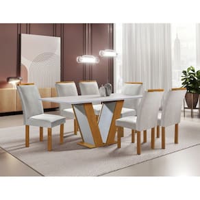 Seu design contemporâneo e clean combina perfeitamente com qualquer estilo de decoração, desde os mais clássicos até os mais modernos. As 06 cadeiras inclusas também seguem esse mesmo padrão, oferecendo conforto ergonômico e um charme adicional ao conjunto.