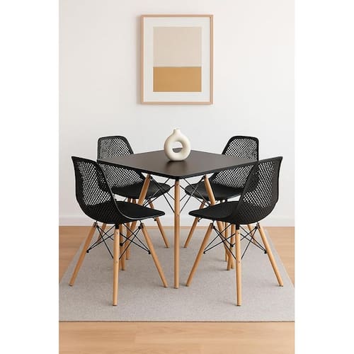 Tampo em material resistente, pés em madeira natural, estrutura das cadeiras em material resistente.Vendido e entregue por MASTER MOBILE MOVEIS LTDA