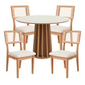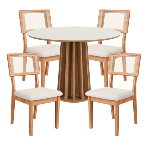 O Conjunto de Mesa de Jantar Redondo com 4 Cadeiras une elegância, praticidade e conforto. Dispõe de uma mesa funcional com um tamanho que se adequa a diversos ambientes e uma base com detalhe ripado que faz toda a diferença em qualquer estilo de decoração. Já as cadeiras estofadas com encosto em tela, garante conforto e estilo. Produzidos com materiais de excelente qualidade, oferecendo qualidade e durabilidade.