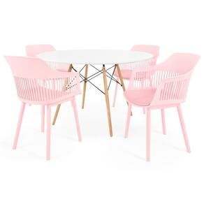 Cor: Rosa | Fabricante: Magazine Decor | Quantidade de Lugares: 4 | Peso do Produto: 50 | Largura: 100 | Produto: Mesa e Cadeiras | Altura: 75 | Tonalidade: Rosa | Tipo de Conjunto: Mesa e Cadeiras | Áreas Indicadas: Cozinha | Coleção Jardim: Não | Uso Indicado do Móvel: Mesa de Jantar | do modelo: 1 | Exige montagem: Sim | Baterias são necessárias?: Não | Certificação de teste externa: Não | Is Fragile: Não | de caixas: 2 | da peça: 1 | Peso do item: 50 | Principais Características do Produto (bullet_point#0): O Conjunto de Mesa de Jantar Redonda Eiffel com as Cadeiras Marcela, é uma escolha excepcional para quem busca unir estilo, praticidade e conforto em sua sala de jantar. | Principais Características do Produto (bullet_point#1): A Mesa de Jantar Eiffel, com dimensões de 120cm, é construída em MDF Laqueado de alta qualidade, garantindo durabilidade e facilidade de limpeza. | Principais Características do Produto (bullet_point#2): O visual moderno e minimalista da Cadeira Marcela adiciona um toque de elegância ao seu espaço. | Componentes incluídos: 1 Mesa + 4 Cadeiras | Quantidade de itens: 5 | Dimensões do item P x L x A: 75x100x100