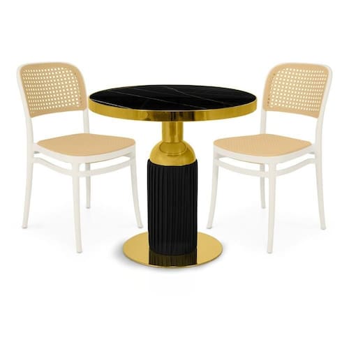 A combinação dos materiais é o grande diferencial deste conjunto. A mesa traz um tampo em mármore sintético de aparência luxuosa, com base metálica resistente e detalhes em courino ecológico PU, que aliam sustentabilidade e elegância. Já as cadeiras, feitas em 100% polipropileno, oferecem leveza, durabilidade e fácil manutenção. Ideais para o dia a dia.