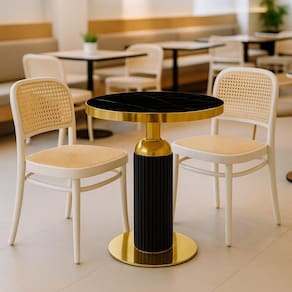 A mesa Imperial destaca-se pelo seu formato redondo de 70cm, que favorece a convivência e otimiza o espaço. Seu tampo de mármore sintético é fácil de limpar e altamente resistente ao uso diário. A base em metal garante firmeza e durabilidade, enquanto o acabamento em courino ecológico PU adiciona um toque de sofisticação, complementando o design com elegância.
